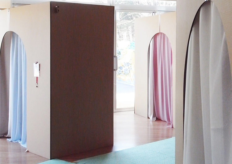 また、テキスタイルデザイナー安東陽子氏の考案により、ブースの入口には2色組み合わせたシフォン素材でカーテンを設置した。シフォン素材は見た目にも美しく、カーテンをスライドさせれば透明度が調節できる。何より、極端な境界が生まれ無いように配慮した。