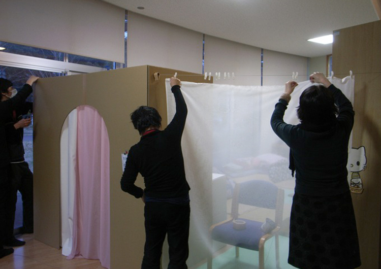 この市民ホールの設計に携わり、田野畑村とは数十年来の付き合いがあった古谷氏は、村からの依頼を受け、避難所用のプライベート・ブース(個室空間)を制作した。